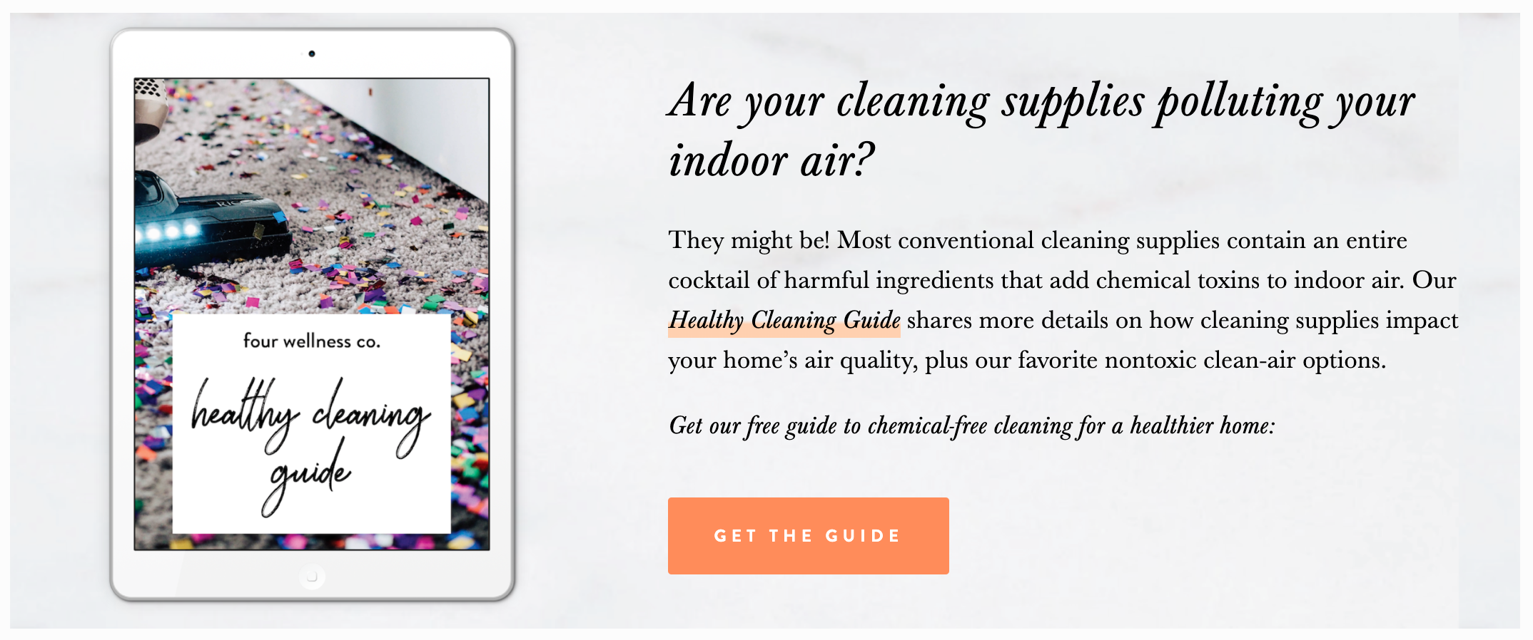 Here are a couple examples of opt-ins we use in our own blog posts to connect with readers who may be interested in more content similar to what they’re currently viewing: 1) an offer to subscribe to our regular newsletter, and 2) a freebie that specifically applies to people interested in natural products for their home (this one is placed in a blog post about indoor air quality).