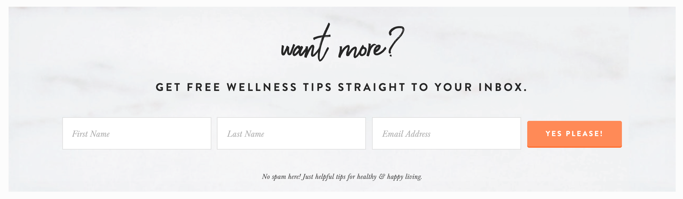 Utilizing opt-in forms on your website is an essential way to grow your email list (aka your interested audience members and potential health coaching customers) by capturing information from visitors who stop by your site and happen to like your content.