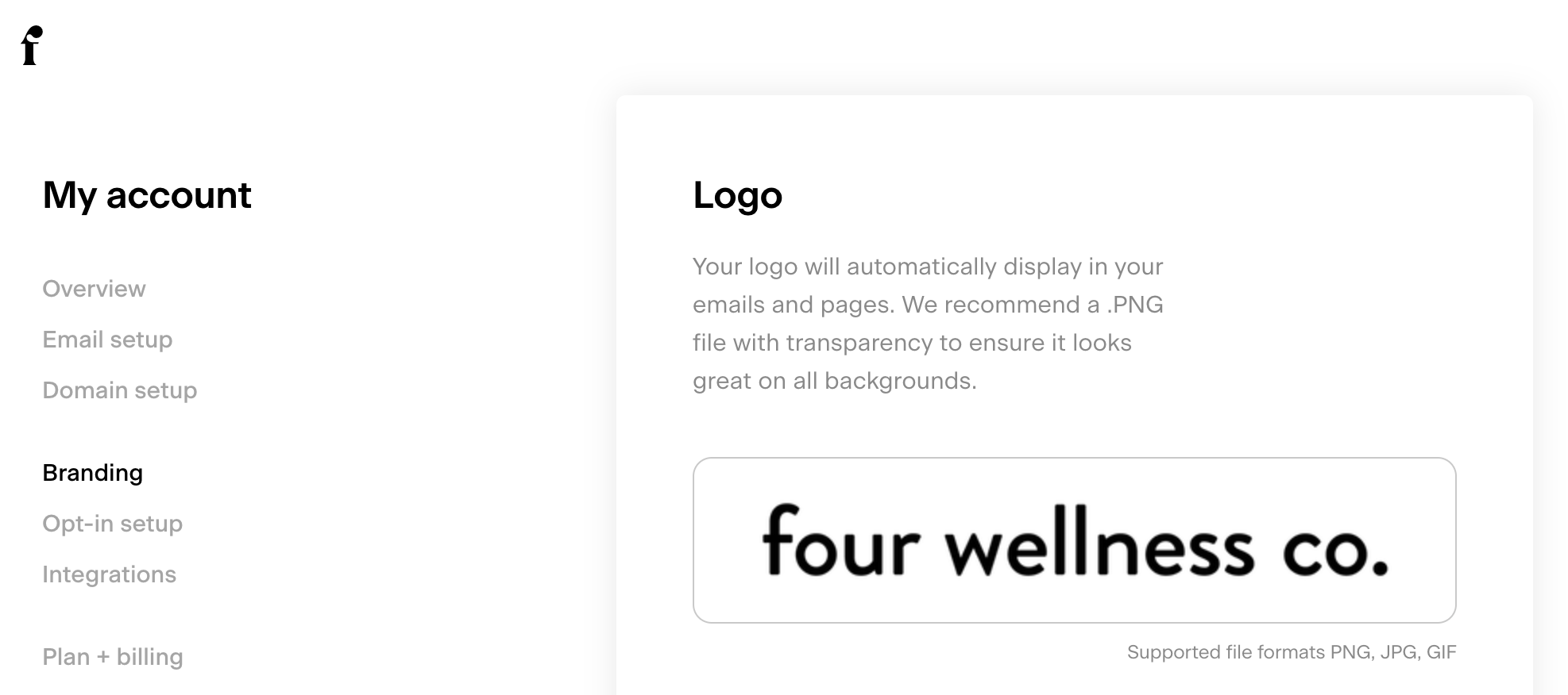 In Flodesk, you can actually add your logo directly to your Flodesk account and it will auto-populate into the logo block in any of their email templates. To add your logo, just head to Account > Branding > Logo and upload your logo. It’s best to use a transparent .png image so it will look great on any background you end up using!
