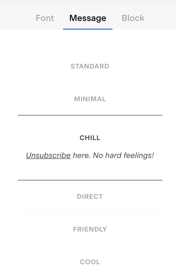 You have the option to choose from several pre-written unsubscribe messages, which are pretty cute: