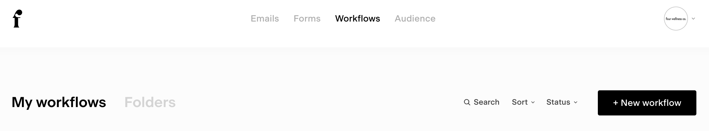 The process for creating a welcome automation is pretty similar in Flodesk. Head to your Workflows tab (“workflow” is synonymous with “automation” here) and click + New workflow.