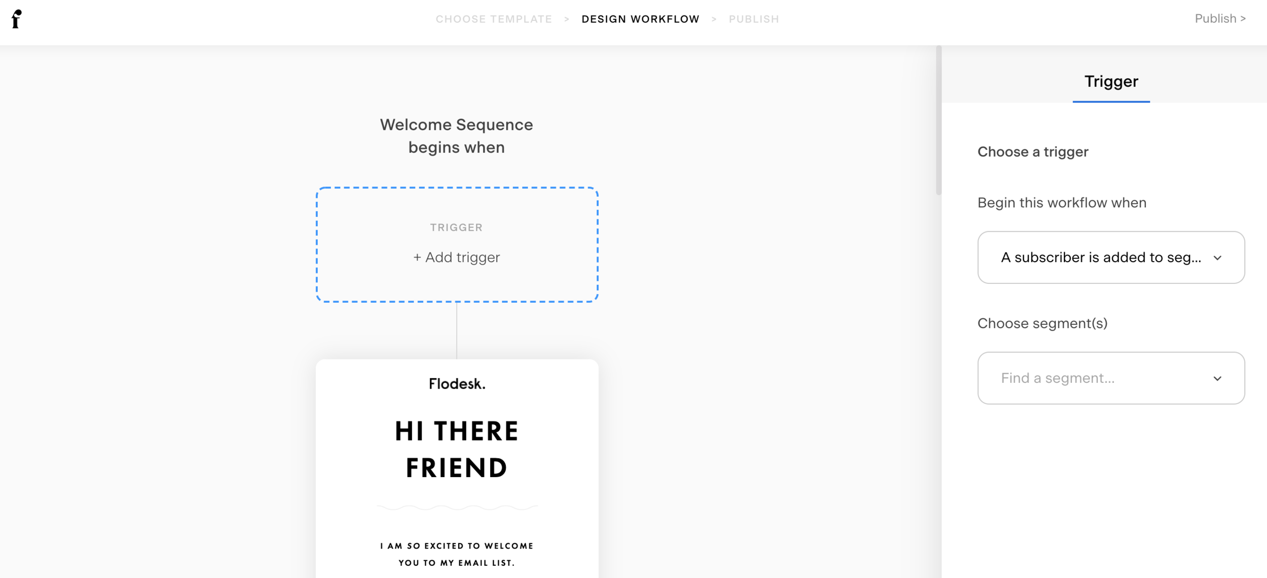 Choose a trigger: This is the “trigger” that tells your automation when to begin. For a welcome automation, it would be “Subscriber is added to segment” and you’d choose the appropriate segment your new subscribers are being added to.